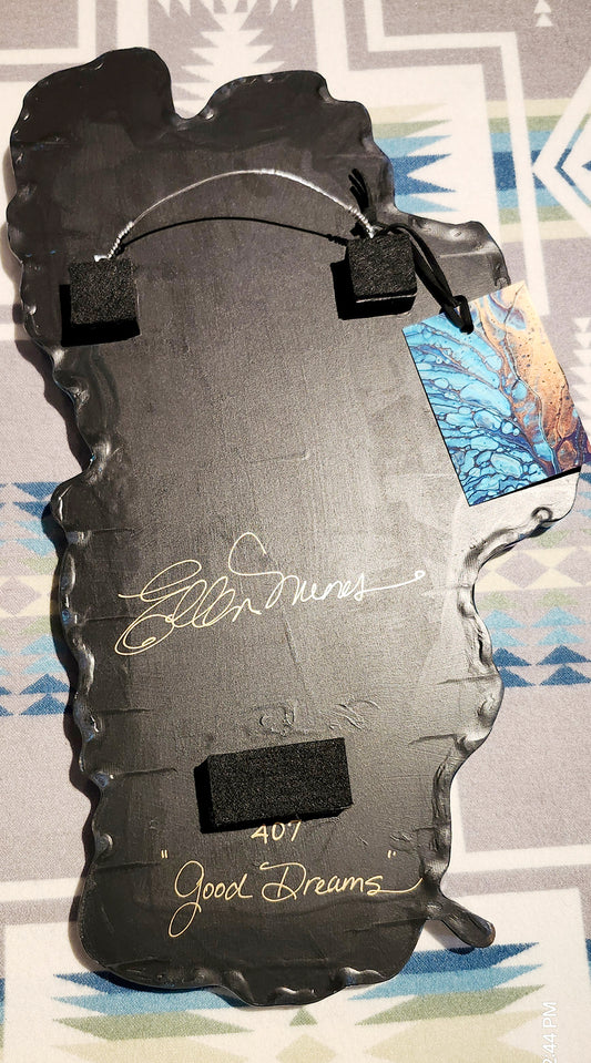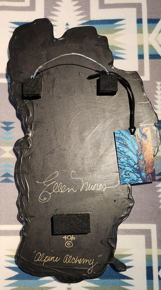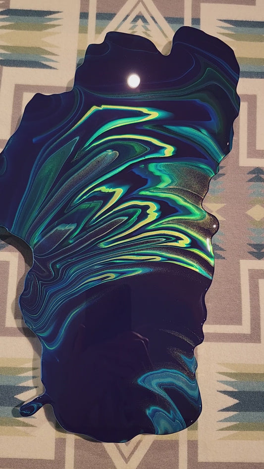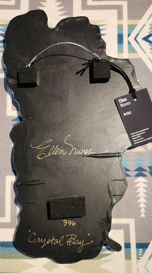 Each painting I make is a celebration of our National Treasure, Lake Tahoe. Each 16 x 9 silhouette of Lake Tahoe is hand milled by my husband Randy and painted by me. I finish each Lake with a clear coat of Resin which enhances the work, providing a glittering vibrant piece of art that evokes the serenity and beauty of Lake Tahoe. I use archival quality products ensuring you will enjoy your painting for many years to come.