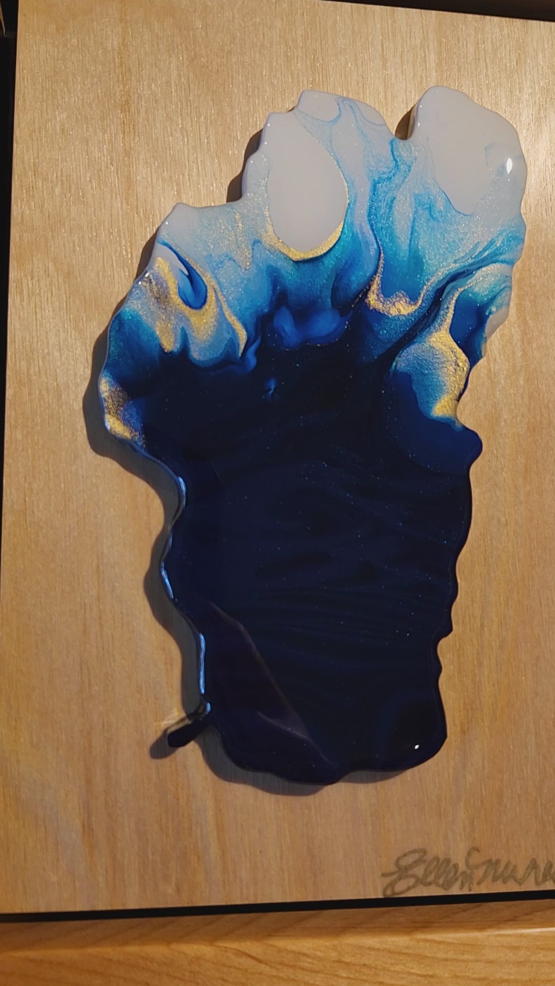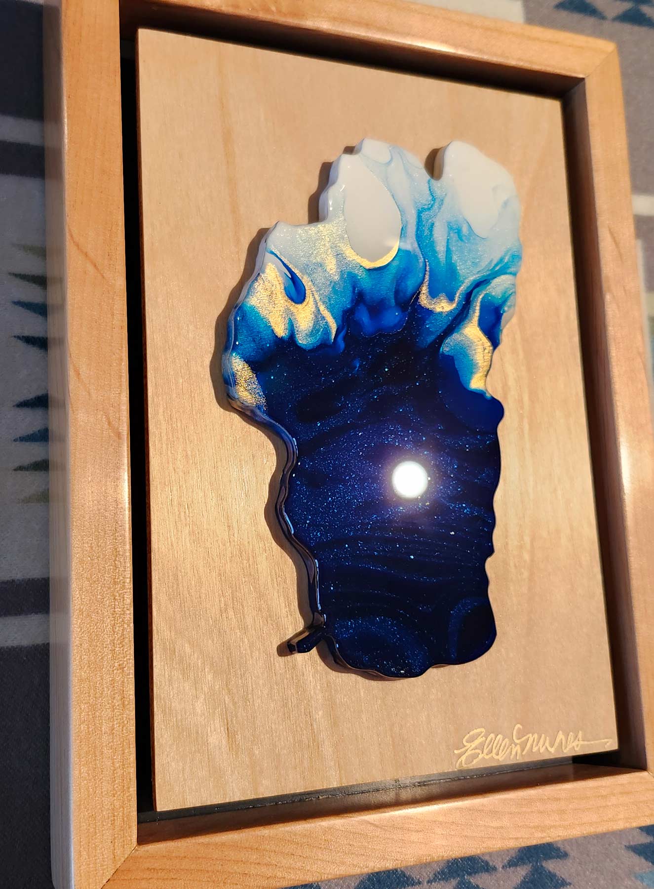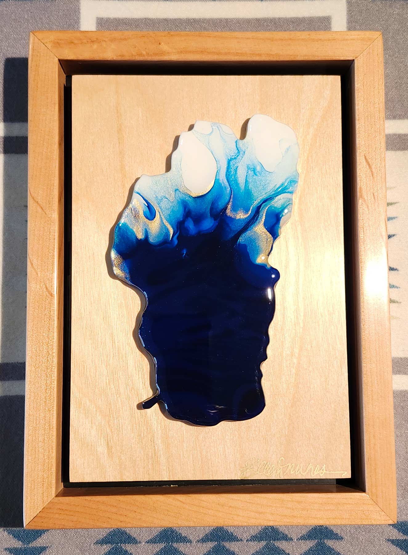 The Jewel of the Sierra Collection is a series of framed paintings of Lake Tahoe, mounted on birch and framed in Alder. Jewel of the Sierra no. 144 measures 7 x 9" and is painstakingly made by my husband Randy and I. I create an original painting and finish it with resin before I mount it onto the birch panel. Randy is a retired firefighter from Tahoe Douglas Fire District and loves woodworking. He makes all of my frames, panels, and Lake Tahoe substrates (Panels to paint on). Each piece in the collection is signed and numbered.