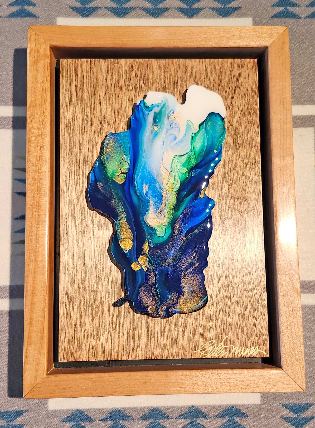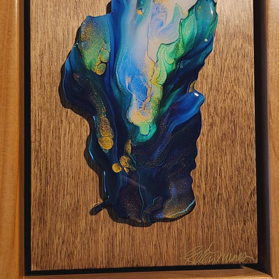 The Jewel of the Sierra Collection is a series of framed paintings of Lake Tahoe, mounted on birch and framed in Alder. Jewel of the Sierra no. 143 measures 7 x 9" and is painstakingly made by my husband Randy and I. I create an original painting and finish it with resin before I mount it onto the birch panel. Randy is a retired firefighter from Tahoe Douglas Fire District and loves woodworking. He makes all of my frames, panels, and Lake Tahoe substrates (Panels to paint on). Each piece in the collection is signed and numbered.