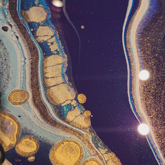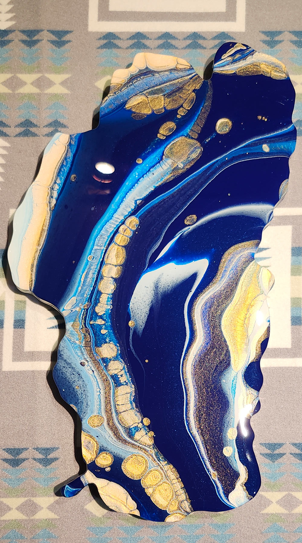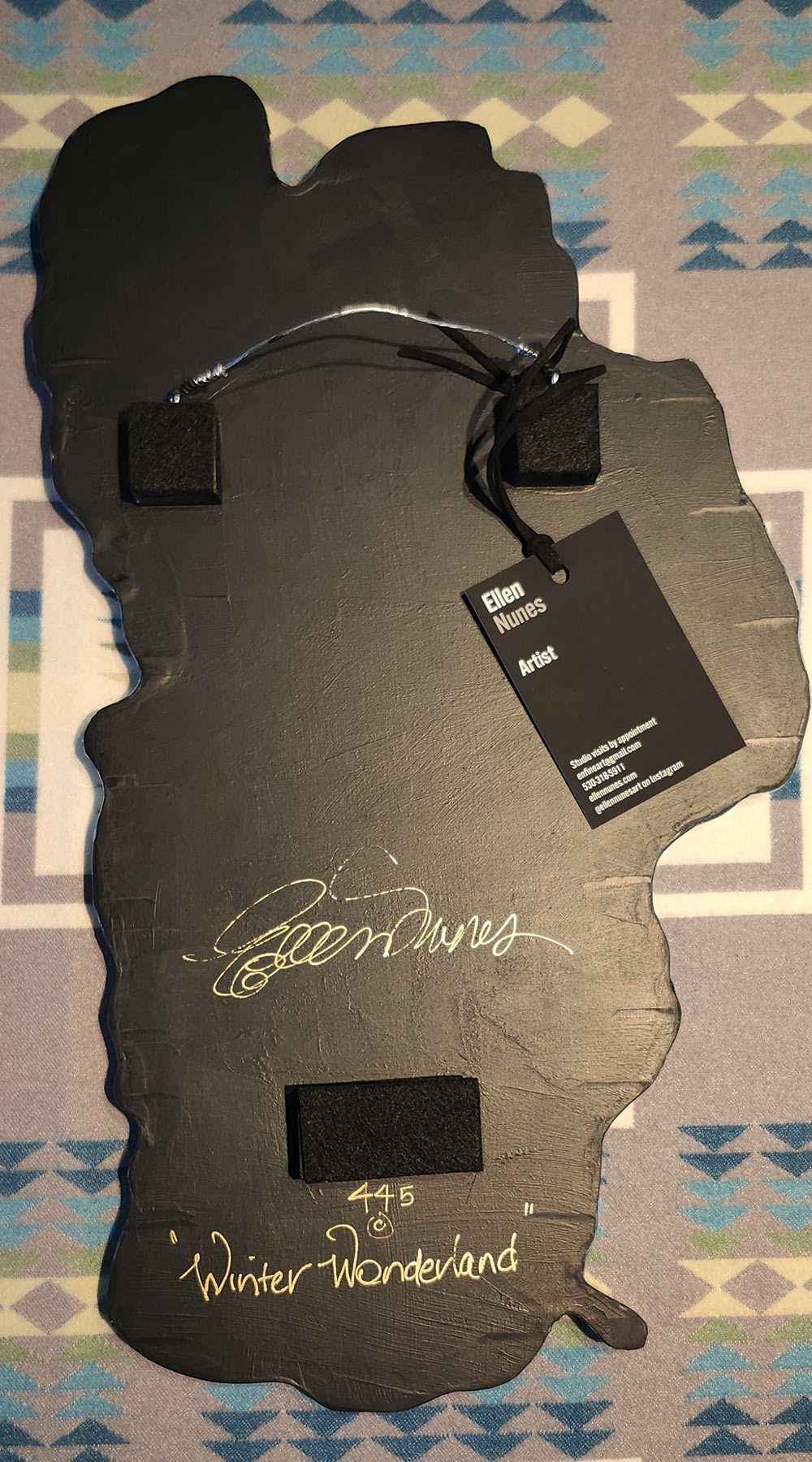 "Winter Wonderland" Tahoe Painting is an original acrylic on mdf 16x9 painting on the silhouette of Lake Tahoe. "Winter Wonderland" is finished with a clear coat of resin. This painting is made to float on the wall and is finished with felt and embellished with a number, signature and title in gold.